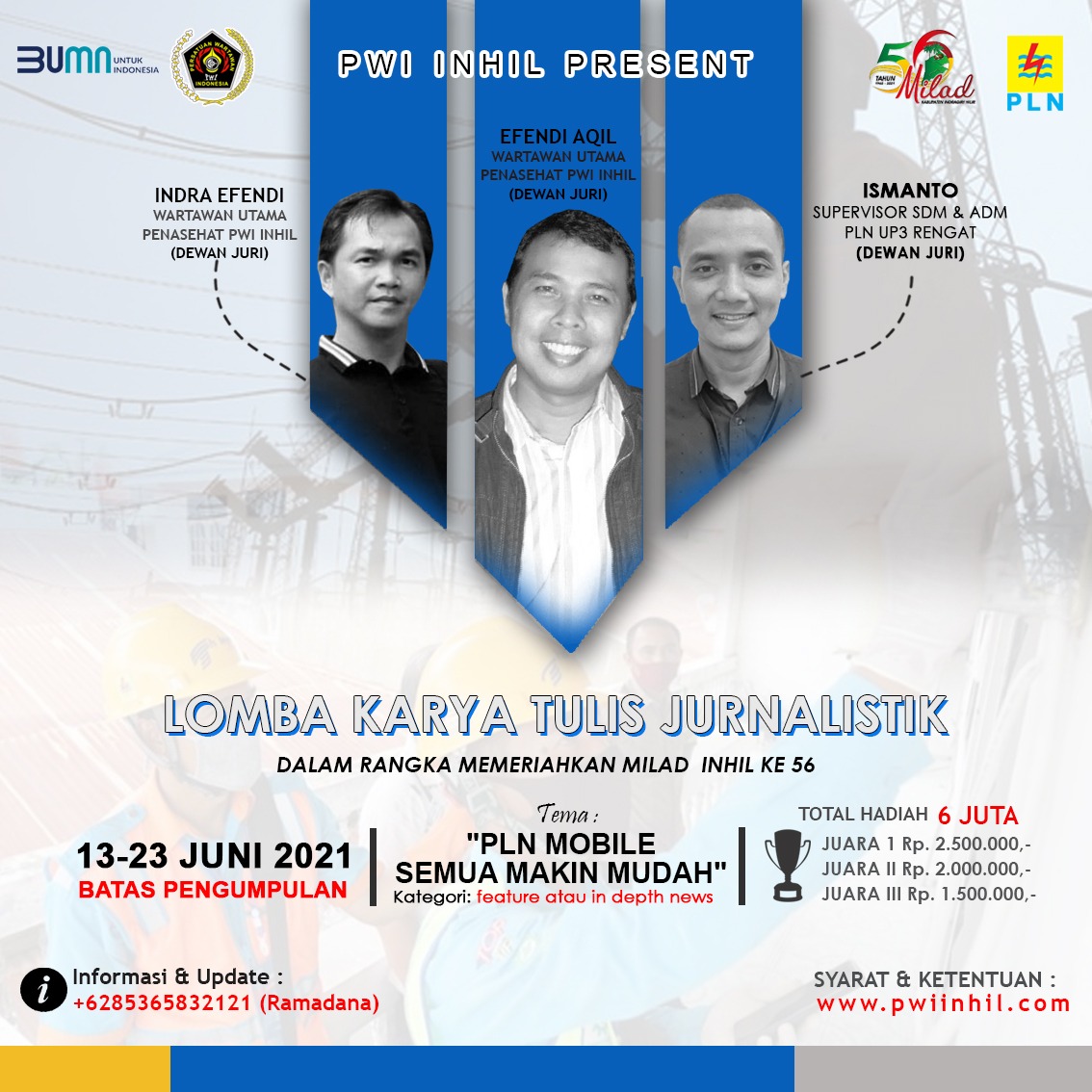 Untuk info lebih lanjut seluruh peserta bisa mengunjungi Website resmi PWI Inhil http://www.pwiinhil.com. (mir/rls)