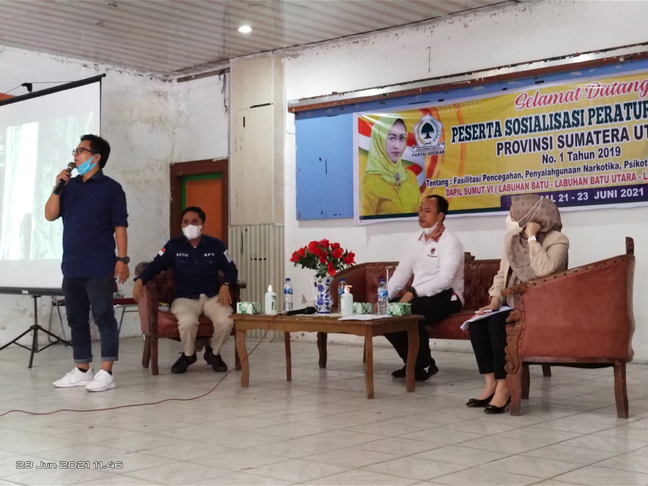 LABUHANBATU (MR) - Dalam rangka menyambut Hari Bhayangkara ke-75, Kapolres Labuhanbatu AKBP Deni Kurniawan melalui Kasat Narkoba AKP Martualesi Sitepu bersama Anggota DPRD Tk I Erni Aryanti,SH dari Partai Golkar menggelar kegiatan sosialisasi bahaya penyalahgunaan narkoba dan penanggulangannya pada Senin (28/06/2021) di Gedung Nasional Rantauprapat.
