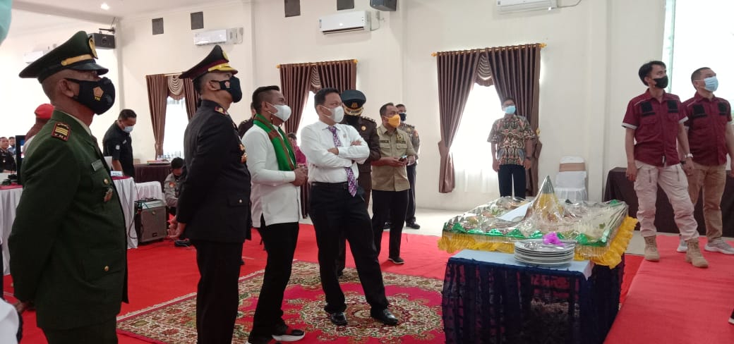 PANGKALANKERINCI (MR) - Kapolres Pelalawan AKBP Indra Wijatmiko SIk beserta jajaran Forum Komunikasi Pimpinan Daerah (Forkopimda) mengikuti upacara virtual Hari Bhayangkara Ke - 75, 1 Juli 2021 dari Aula Teluk Meranti Polres Pelalawan, Kamis (1/7).