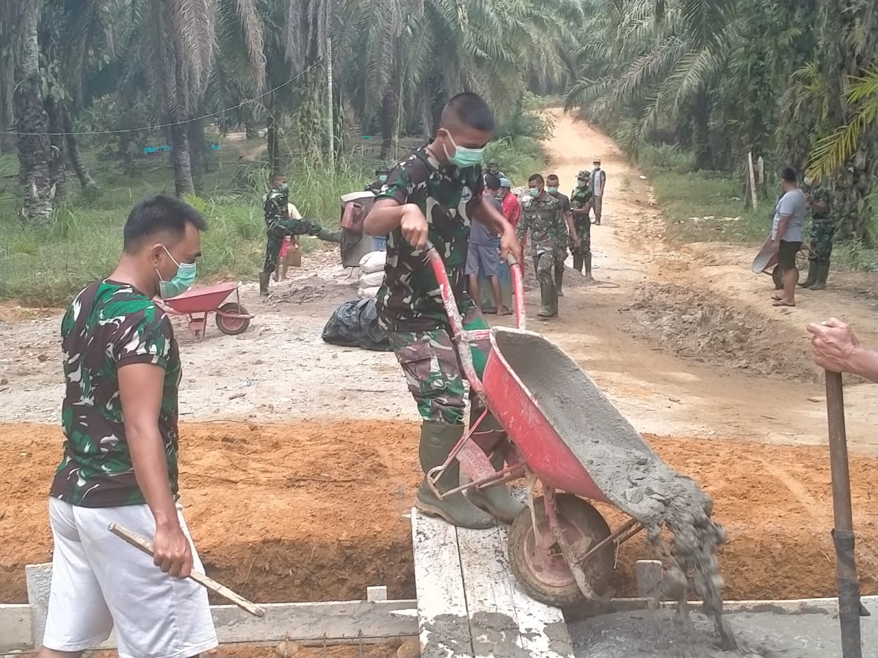 ROHIL (MR) - Satuan Tugas (Satgas) TMMD Kodim 0321/Rokan Hilir yang dipimpin Sertu Dedi Purnama bersama warga kembali melanjutkan pembangunan box culvert berlokasi di Kepenghuluan Bagan Sinembah Jaya, Kecamatan Bagan Sinembah Raya (Basira), Rohil, pada Jumat (9/7/2021).