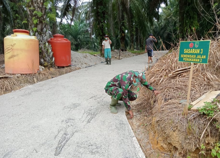 ROHIL (MR) - Pembangunan jalan pemakaman sepanjang 200 meter berlokasi di RT 02 RW 01 Dusun Bukit Lima Kepenghuluan Bagansinembah Jaya, Kecamatan Bagansinembah Raya (Basira) selesai dibangun Tim Satgas TMMD ke-111 Kodim 0321/Rohil tahun 2021.