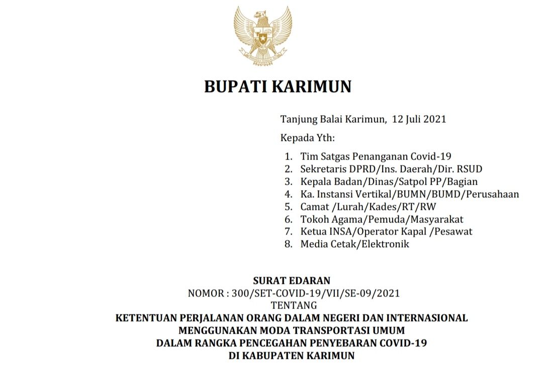 Berikut SE Bupati Karimun, Sertifikat Vaksin Covid-19 jadi Syarat Wajib Perjalanan