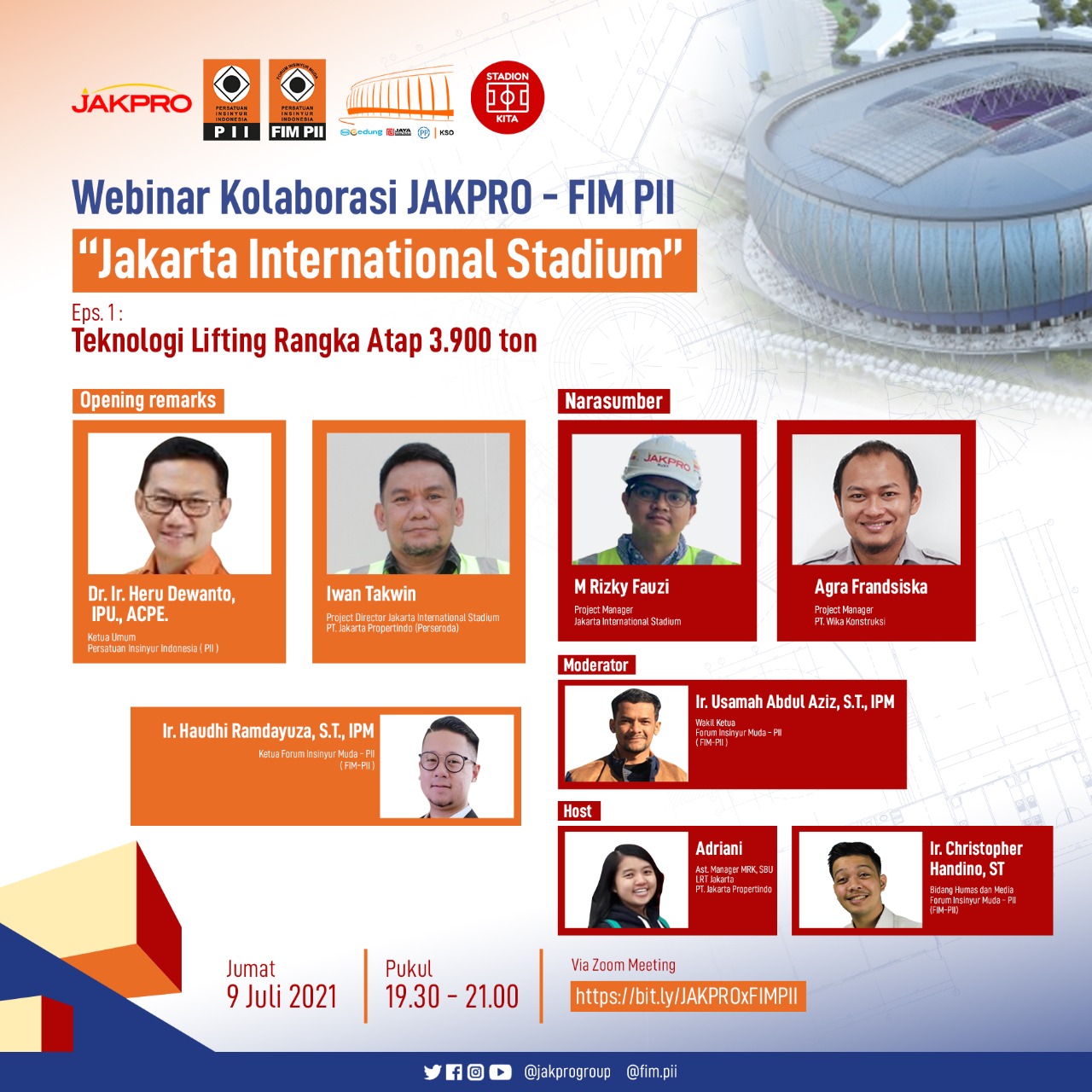 JAKARTA (MR) – PT Jakarta Propertindo (Perseroda) ("Jakpro") dan Forum Insinyur Muda- Persatuan Insinyur Indonesia (FIM-PII) mengadakan webinar yang membahas teknologi lifting atap 3.900 ton proyek Jakarta International Stadium (JIS), 9 Juli 2021