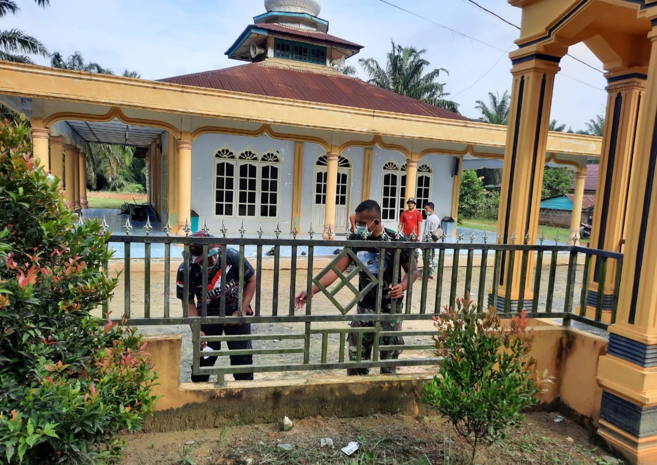 TNI bersama warga bekerjasama membersihkan halaman masjid dan melakukan pengengecatan pagar Masjid Nurul Iman Dusun Salean Kepenghuluan Bagan Sinembah Jaya.