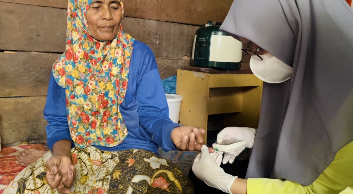 Mahasiswa berkeliling kampung dari rumah ke rumah ditemani dua pendamping yang mengenal daerah sekitar desa sehingga sasaran lansia tepat.