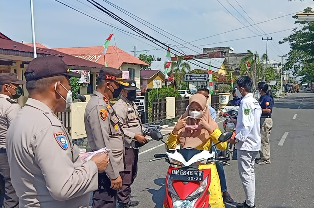 Pembagian masker di bagikan sebanyak 600 buah kepada masyarakat pengguna jalan yang dilakukan dengan menerapkan protokol kesehatan. Kegiatan bagi bagi masker dilakukan di Jalan Perwira Kecamatan Bangko, Kabupaten Rokan Hilir berlangsung di depan Mapolsek Bangko.
