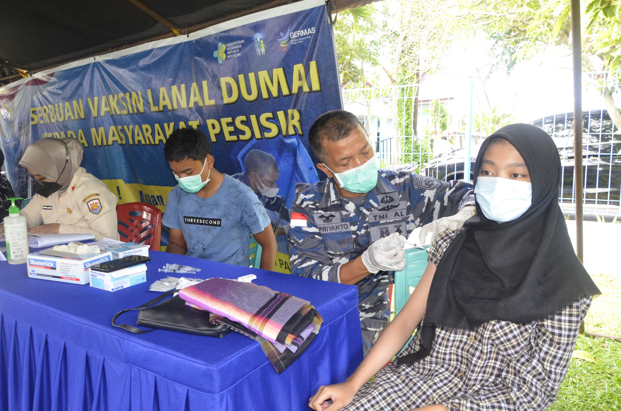 DUMAI (MR) - Pangkalan TNI Angkatan Laut (AL) Dumai kembali menggelar Vaksinasi kepada masyarakat dan pemberian vaksin mulai menyasar kepada anak-anak Remaja usia 12-17 tahun dengan dosis Pertama dan Kedua.