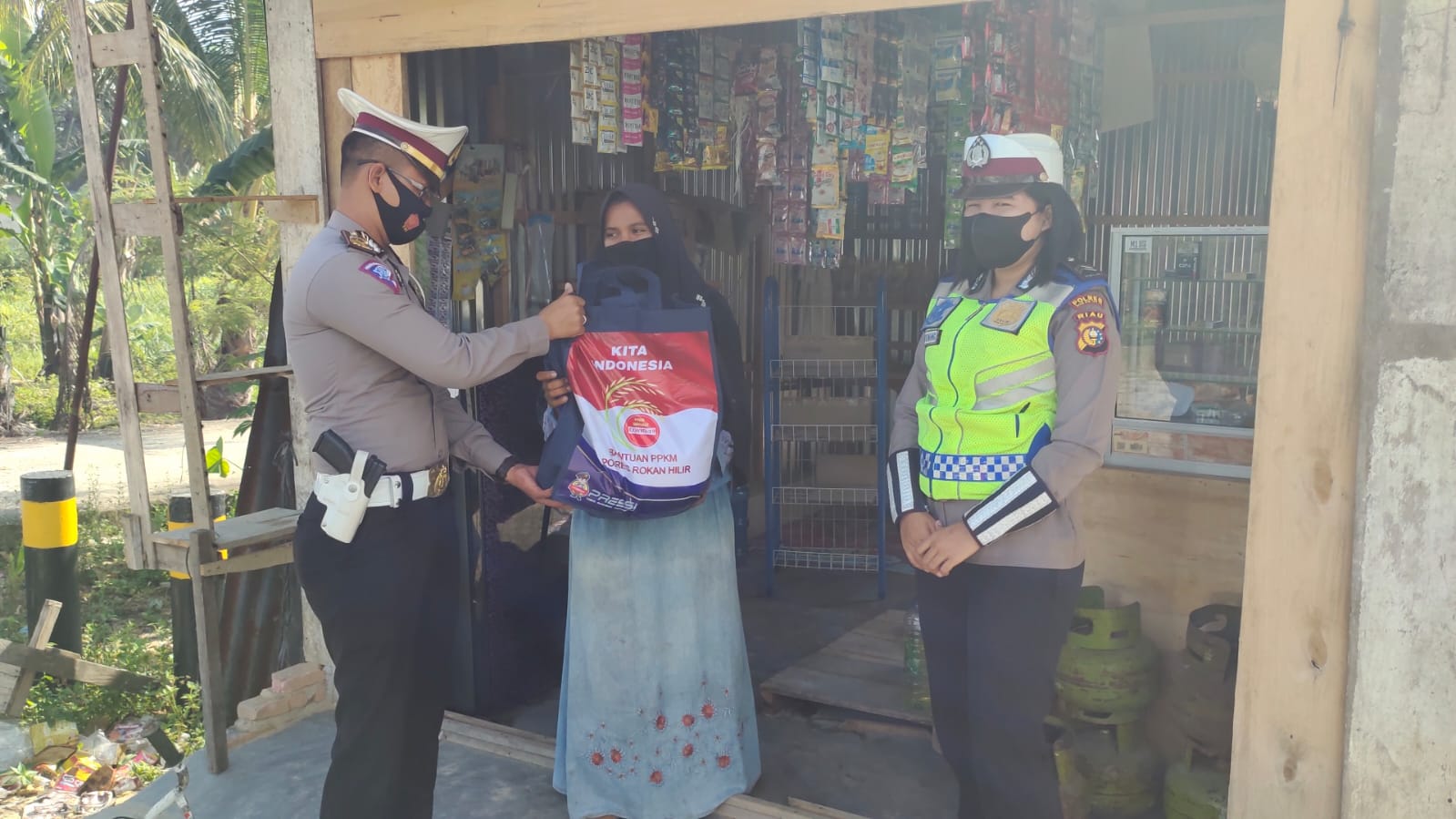 ROHIL (MR) - Satuan lalulintas (Satlantas) Polres Rokan Hilir memberikan bantuan PPKM kepada para pedagang kaki lima di desa Simpang Benar Kelurahan Cempedak Rahuk kecamatan Tanah Putih di sela melakukan patroli, pada Jumat (06/08/2021).