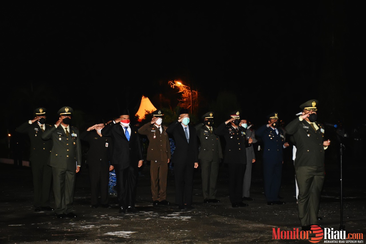 DUMAI (MR) - Komandan Distrik Militer (Dandim) 0320/ Dumai, Letkol (Inf) Irdhan memimpin Apel Kehormatan dan Renungan Suci (AKRS) yang berlangsung di Taman Makam Pahlawan (TMP) Sentosa, Jalan Soekarno Hatta, Kota Dumai, Senin malam (16/08/2021).