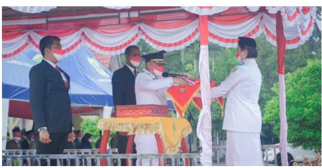 LINGGA (MR) - Bupati Kabupaten Lingga Muhammad Nizar memimpin upacara HUT Kemerdekaan ke 76 di halaman Kantor Bupati, Selasa (17/08/2021) meski diguyur hujan sejak awal pembukaan upacara pengibaran Sang saka Merah Putih berlangsung Khidmat.