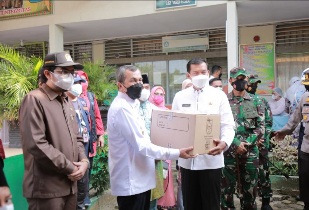 Penyerahan bantuan ini dilakukan oleh Gubri Syamsuar saat melakukan peninjauan langsung pelaksanaan vaksinasi Covid-19 kepada pelajar bertempat di SMPN Negeri 08 Pekanbaru, pada Jumat, (30/07/2021).
