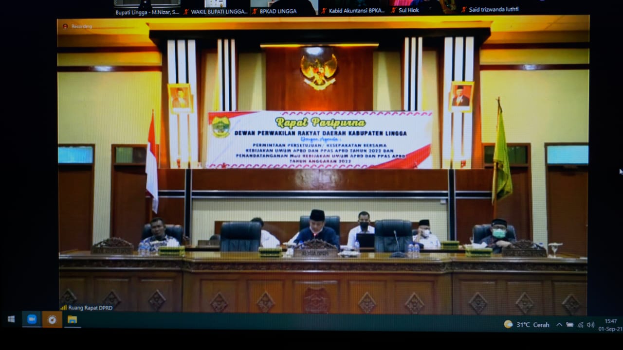LINGGA (MR) - Pemerintah Daerah bersama DPRD Kabupaten Lingga melaksanakan Paripurna secara virtual dengan Agenda Permintaan Persetujuan/Kesepakatan Bersama Kebijakan Umum APBD dan PPAS APBD Tahun anggaran 2022 serta penandatanganan MoU Kebijakan Umum APBD dan PPAS APBD Tahun Anggaran 2022, Rabu (01/09/2021).