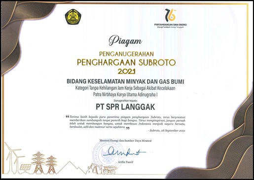 ROHUL (MR) - PT SPR Langgak meraih penghargaan Subroto 2021 Bidang Keselamatan Migas, yaitu Patra Nirbhaya Karya Utama Adinugraha I dari Kementrian ESDM Republik Indonesia, pada Selasa (28/9/2021).