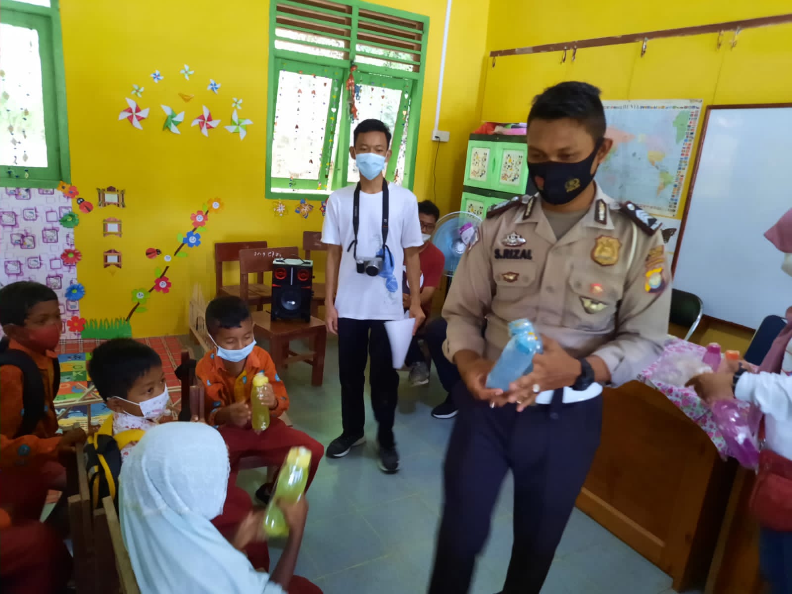 "Selain melaksanakan sosialisasi imbauan tentang pengenalan lalu lintas, kita juga membagikan bingkisan kepada siswa-siswi berupa botol minuman, dan kegiatan berlangsung sesuai protap protokol kesehatan", ujar Samsurizal.