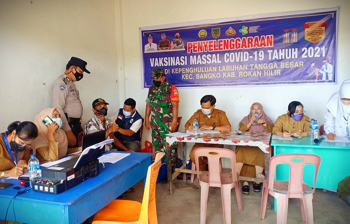 ROHIL (MR) - Tingkatkan kesuksesan vaksinasi masal COVID-19, Kapolsek Bangko Kompol Sasli Rais, SH bersama pihak Kepenghuluan dan Puskesmas se Kecamatan Bangko dan pihak Kecamatan Pekaitan gencar melaksanakan kegiatan vaksinasi kepada masyarakat, berlangsung, Senin (22/11/2021).