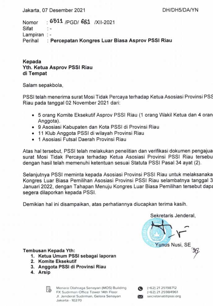 Surat yang ditandatangani Sekretaris Jenderal PSSI, Yunus Nusi SE tersebut berisi balasan surat mosi tidak percaya terhadap Ketua Asosiasi Provinsi PSSI Riau pada tanggal 2 November 2021 lalu.