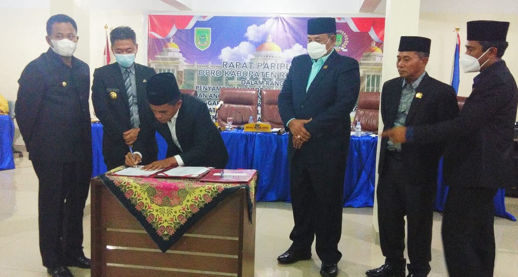 Dihadapan Bupati Rokan Hilir Afrizal Sintong dan Wakilnya H Sulaiman, SS.MH Ketua DPRD Rokan Hilir Maston didampingi para Waka tandatangani tandatangani SK penetapan APBD TA 2022.
