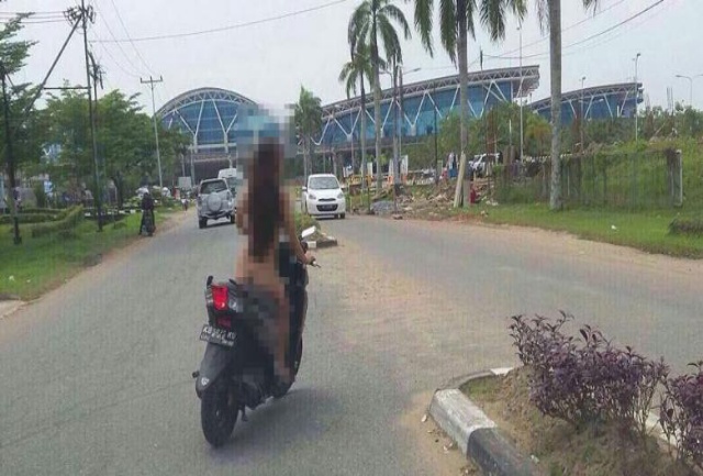 MONITORRIAU.COM - Seorang perempuan tanpa busana nekat mengendarai kendaraan bermotor di seputaran Jalan Ahmad Yani II dan Bandara Supadio, Minggu siang 15 Januari 2017.
