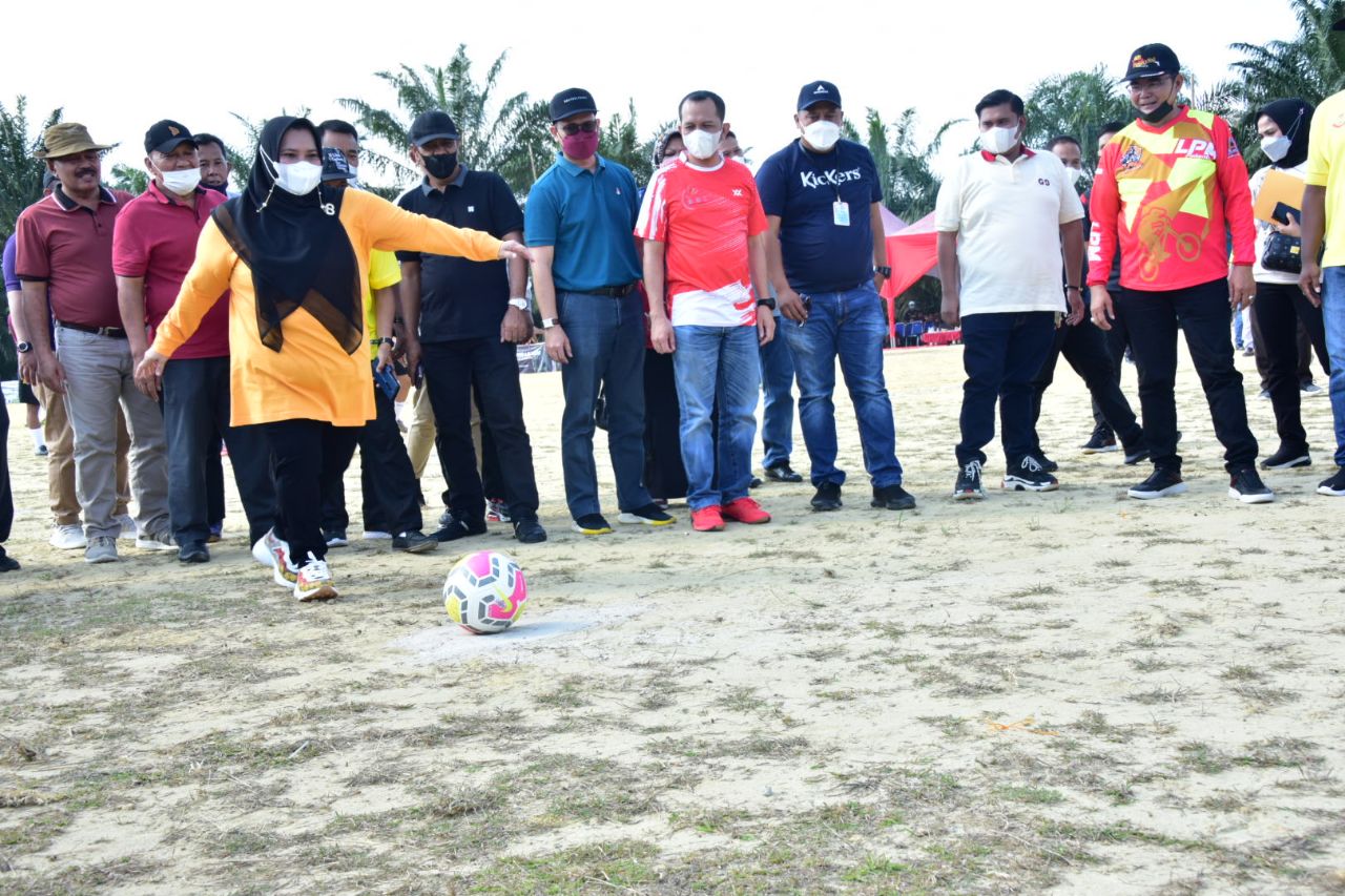 PINGGIR (MR) – Bupati Bengkalis, Kasmarni membuka Turnamen Boscha Super League (BSL) Tahun 2022 di lapangan Sepak Bola Desa Muara Basung, Sabtu 15 Januari 2022.
