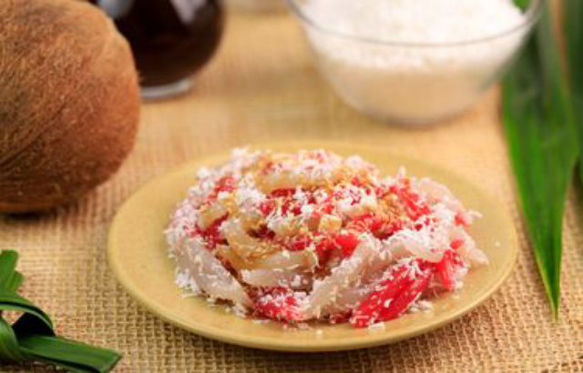 1. Pelapis: Aduk rata kelapa parut, garam, dan daun pandan. Kukus di atas api sedang selama 15 menit. Angkat dan sisihkan.