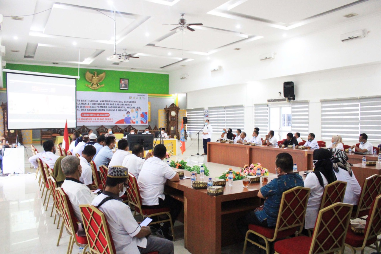 LABUHANBATU (MR) - Sekretaris Daerah (Sekda) Kabupaten Labuhanbatu Ir.Muhammad Yusuf Siagian, MMA menghadiri penutupan Kegiatan Bakti Sosial Vaksinasi Massal Bergerak Alumni Universitas Sumatera Utara (USU) Blusukan di Daerah Pedesaan Kabupaten Labuhanbatu di Ruang Data dan Karya, Kantor Bupati, Kecamatan Rantau Selatan, Rabu (26/01/2022).