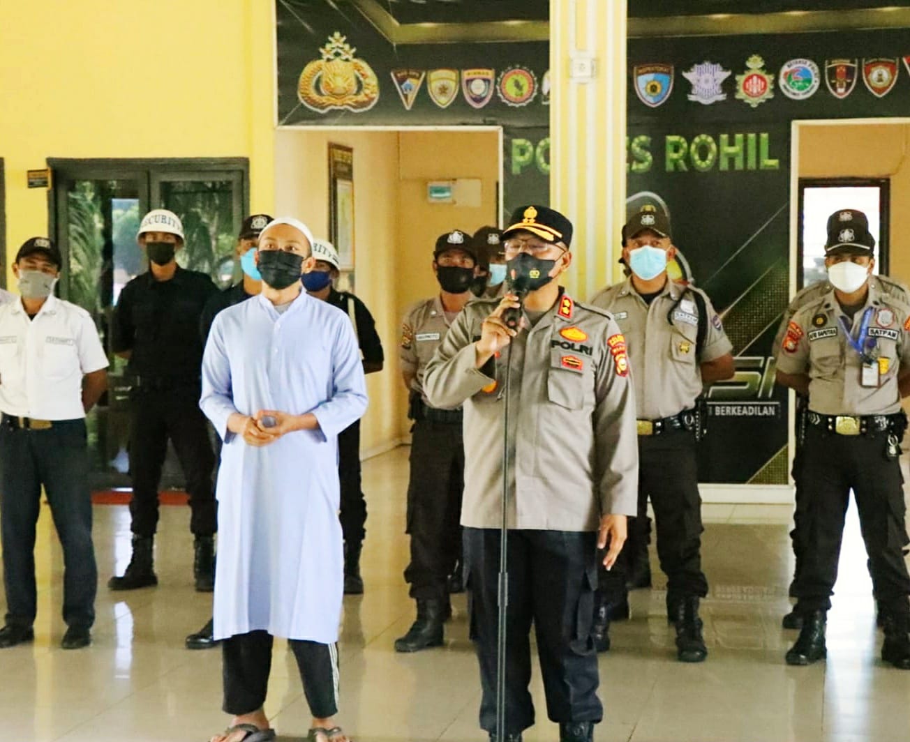 ROHIL (MR) - Kapolres Rohil AKBP Nurhadi Ismanto, SH.SIK hadiri Apel Peringatan Hari Ulang Tahun HUT ke 41 Satuan Pengamanan sekaligus sampaikan arahan agar Satpam jaga Kamtibmas ikut dalam penanggulangan COVID-19 di Mapolres Rohil, Senin (31/1/2022).