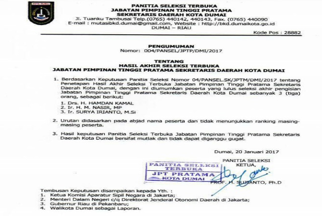 Surat pengumuman tentang hasil akhir seleksi terbuka JPTP ini juga di tembuskan kepada; Ketua Komisi Aparatur Sipil Negara di Jakarta, Menteri Dalam Negeri Cq Direktorat Jenderal Otonimi Daerah di Jakarta, Gubernur Riau di Pekanbaru, dan Walikota Dumai sebagai laporan.