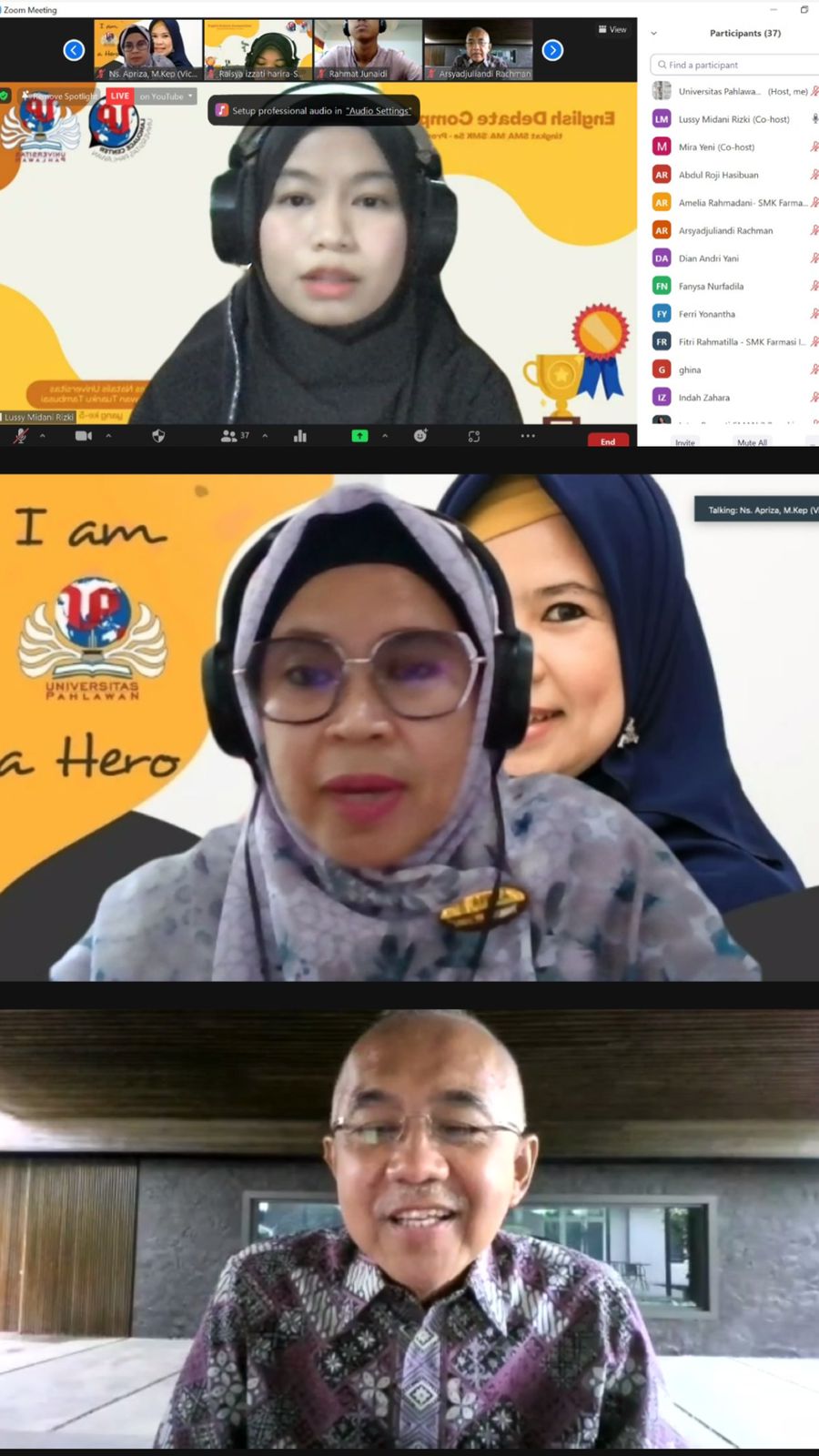 "kegiatan yang di laksanakan secara daring bisa lebih efisien dan mengikuti anjuran pemerintah untuk tidak berkerumun. Semoga kompetisi debat bahasa Inggris ini bisa menjadi ajang siswa untuk lebih mengembangkan potensi diri ditengah pandemi seperti sekarang," kata Ns. Apriza, M.Kep