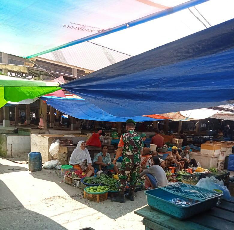 DUMAI (MR) - Sebagai Bentuk Rasa peduli terhadap sesama, Kodim 0320/Dumai melalui Babinsa Koramil-01 Kelurahan Bagan Keladi Sertu Heriyanto, (30/3), Turun ke pasar Pulau Payung.