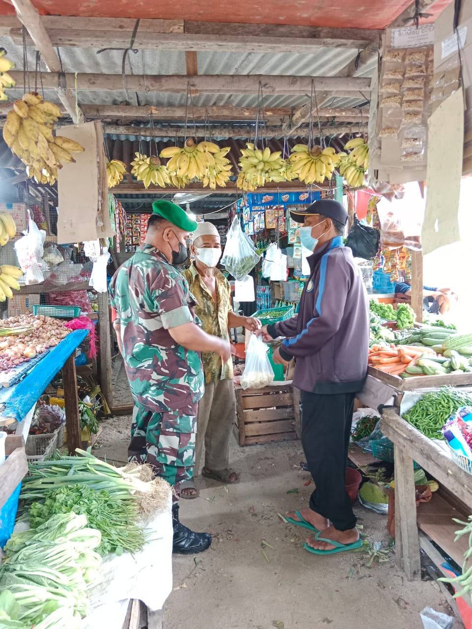 Sertu Mahyudin melakukan sosialisasi pencegahan Covid-19 di salah satu pasar pagi yang ada di wilayah binaannya dan mengajak masyarakat untuk taat Menjalankan program 3 M sebagai bentuk pencegahan Virus Covid-19.