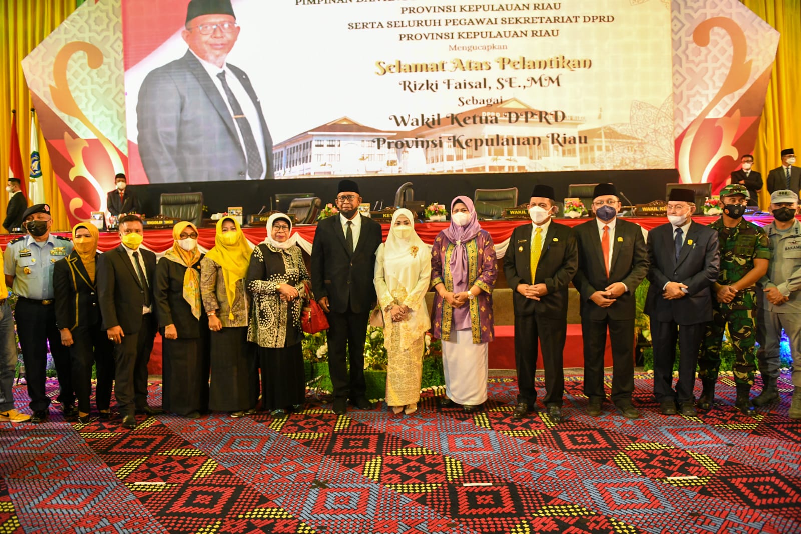 KEPRI (MR) - Gubernur Kepulauan Riau H. Ansar Ahmad menghadiri langsung pelantikan dan pengambilan sumpah Rizki Faisal sebagai Wakil Ketua I DPRD Provinsi Kepri sisa masa jabatan 2019-2024. Pelantikan Rizki Faisal yang menggantikan Hj. Dewi Kumalasari dilakukan pada Rapat Paripurna DPRD Provinsi Kepri yang dipimpin Jumaga Nadeak di Gedung DPRD Provinsi Kepri di Tanjungpinang, Kamis (12/05).