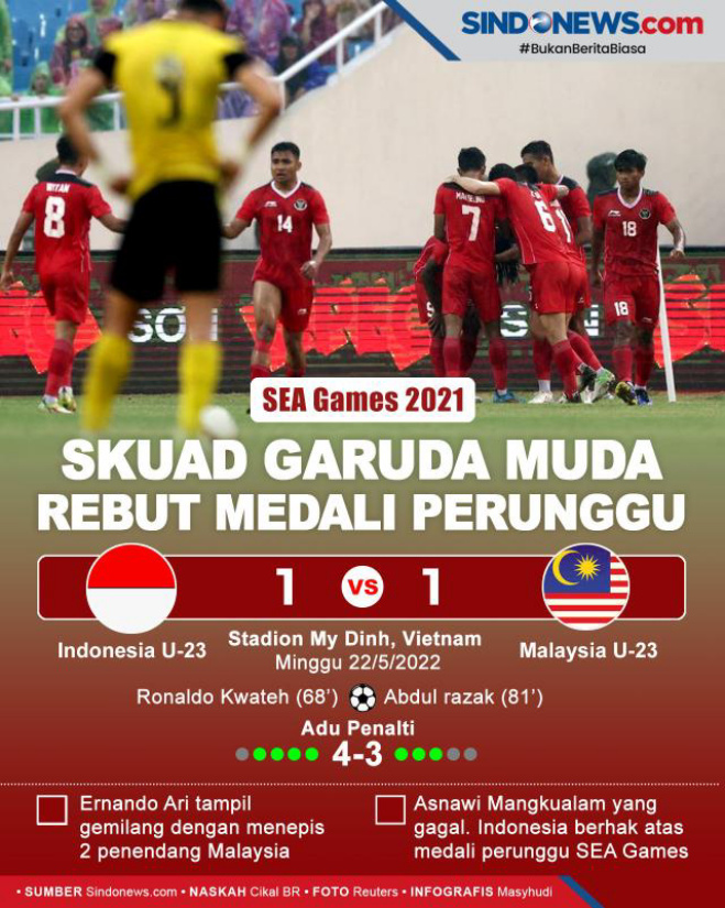 Namun, Malaysia U-23 menyamakan kedudukan via sepakan keras Abdul Razak (81’). Pertandingan pun dilanjutkan ke babak adu penalti. Sebab, tidak ada babak perpanjangan waktu dalam pertandingan perebutan medali perunggu cabor sepakbola putra SEA Games 2021 ini. Indonesia U-23 akhirnya menang 4-3 (1-1). Selengkapnya lihat infografis."*** (SINDONEWS.com)