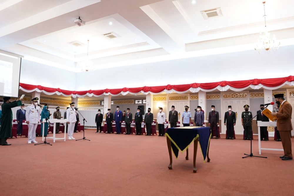 PEKANBARU (MR) - Gubernur Riau (Gubri) Syamsuar resmi mengambil sumpah jabatan dan melantik Kamsol sebagai Penjabat (Pj) Bupati Kampar dan Muflihun sebagai Pj Wali Kota Pekanbaru, di Gedung Daerah Balai Pauh Janggi, Senin (23/5/2022).