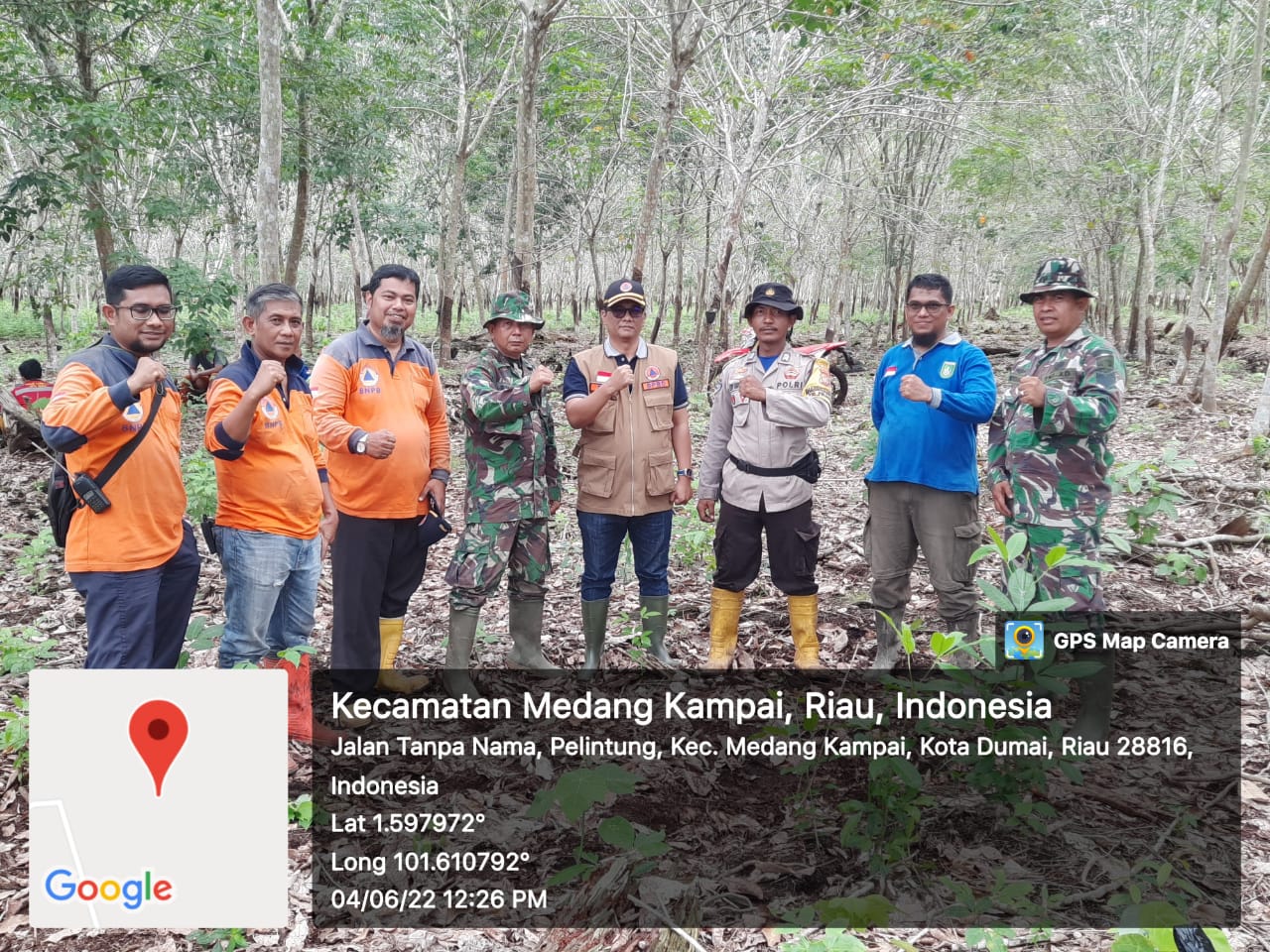 DUMAI (MR) - Sabtu, (4/6), sekira Pukul 12.05 WIB, Babinsa Kelurahan Pelintung dan Tim Pemadaman Karhutla yang bertempat di Lokasi Karhutla Jalan Arifin Ahmad Kelurahan Pelintung Kecamatan Medang Kampai Kota Dumai dikunjungi Oleh M.Edi Afrizal MH. Kalaksa Badan Penanggulangan Bencana Daerah (BPBD) Provinsi Riau.