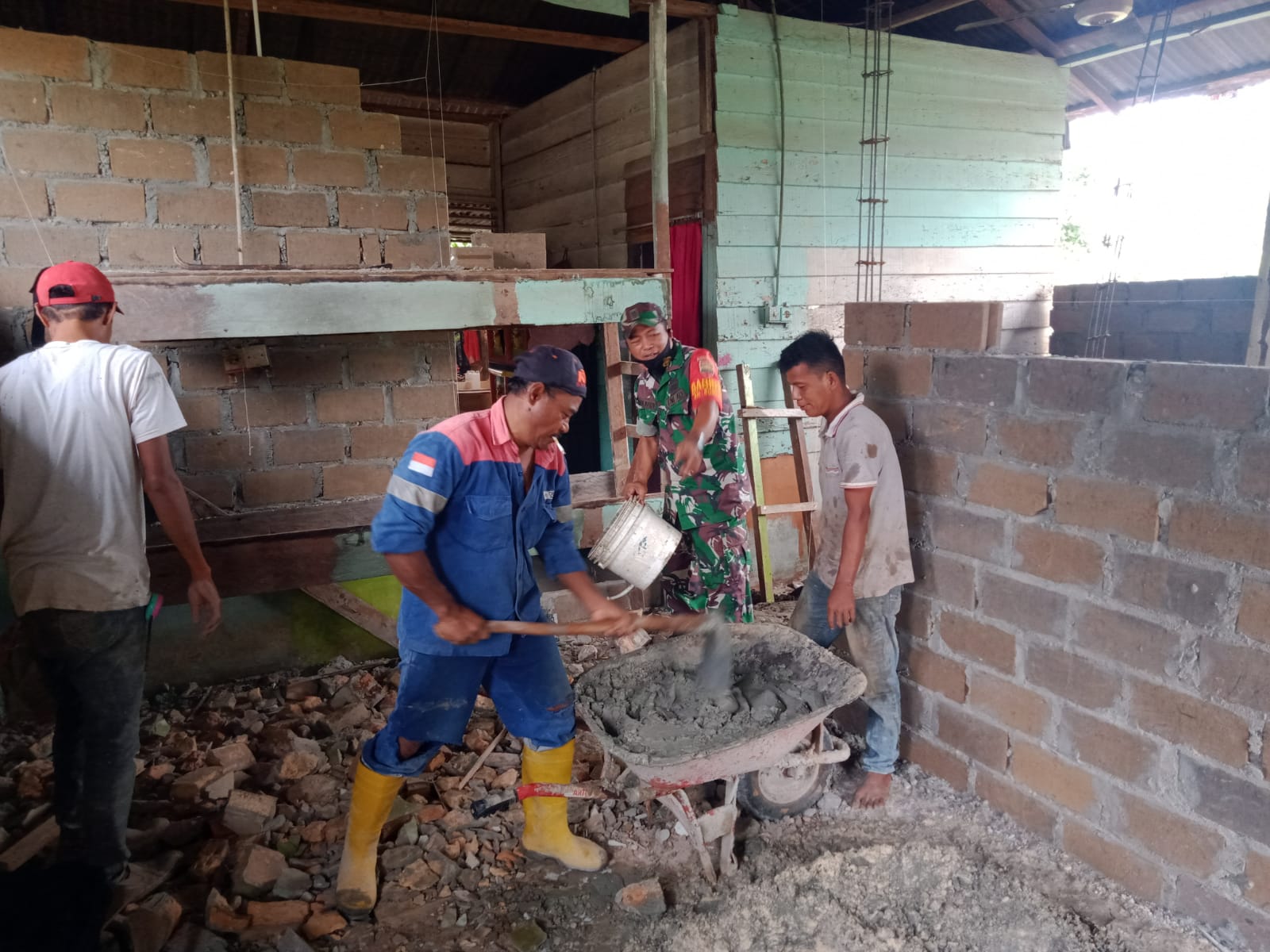 Adapun kegiatan yang dilakukan di sini adalah, mengaduk semen, mengecor dinding bersama-sama dengan masyarakat.