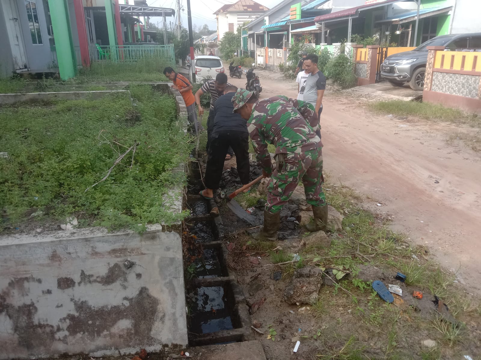 DUMAI (MR) - Babinsa Koramil-01 Kelurahan Bintan Kecamatan Dumai Kota, Sertu Sutiono, melaksanakan gotong royong bersama di perumahan Griya Jalan Abdul Rab Khan Bukit Timah, (26/6).