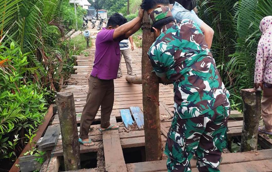 DUMAI (MR) - Upaya membangun kerjasama antara masyarakat dengan TNI telah dilaksanakan oleh Babinsa Koramil Pwk 04/Medang Kampai, dengan ikut turun tangan langsung membantu warga membangun jembatan yang sudah lama rusak akibat banjir.