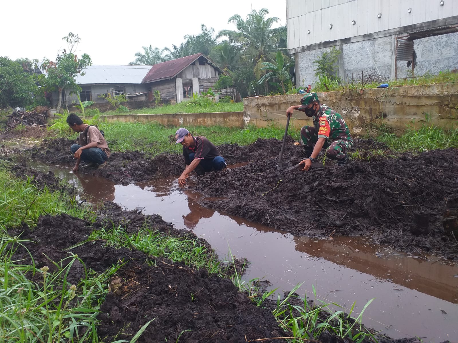 DUMAI (MR) - Kodim 0320/Dumai melalui Babinsa Koramil-01 Kelurahan Simpang Tetap Dahrul Ihsan (STDI) sertu Sugianto, membantu masyarakat untuk membuat saluran selokan, (21/7).