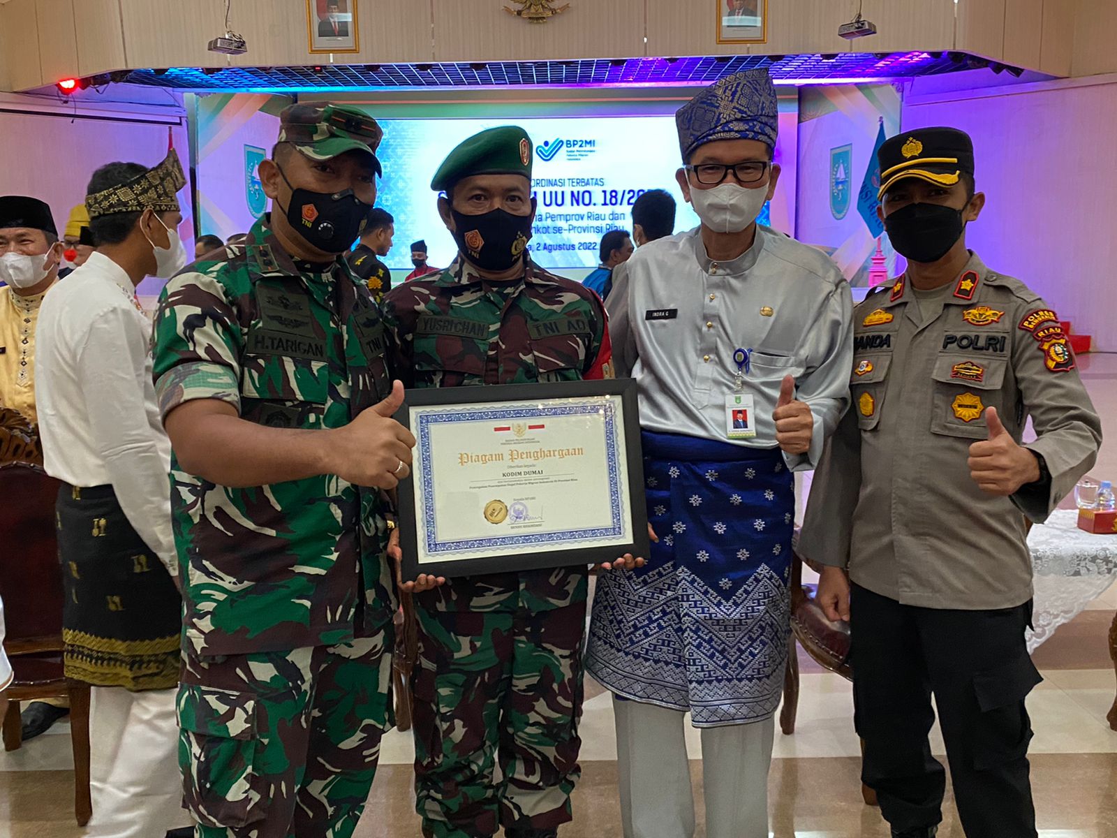 Penghargaan tersebut diserahkan Langsung oleh Kepala BP2MI Benny Rhamdani dan diterima Langsung Oleh Dandim 0320/Dumai Letkol Arh Hermansyah Tarigan SE yang bertempat di Gedung Daerah Balai Serindit Jln.Diponogoro Pekanbaru Riau pada hari Selasa 2 Agustus 2022.