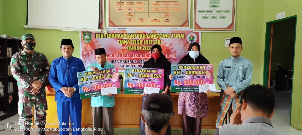RUPAT (MR) – Pemerintah Desa (Pemdes) Makeruh, Kecamatan Rupat, Kabupaten Bengkalis menyalurkan Bantuan Langsung Tunai (BLT) Tahap 8 bertempat di Aula Kantor Desa Rabu (03/8/2022) pagi.