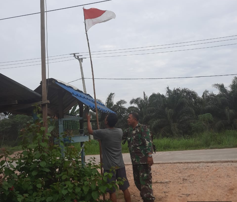 DUMAI (MR) - Pelda Hendrianto selaku Babinsa kelurahan Pelintung menghimbau kepada warga Binaannya untuk memasang bendera merah putih di depan rumahnya masing-masing, (5/8).
