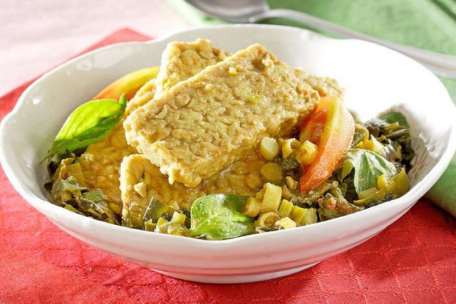 1. Tumis bumbu halus dan semua daun kecuali kemangi hingga harum dan layu. Masukkan 250 mililiter air, tempe, dan tomat, kemudian masak hingga kuah mengental.