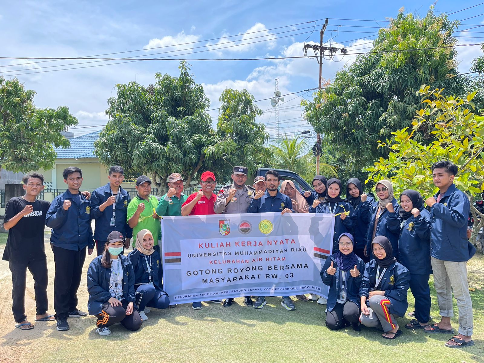 PEKANBARU (MR) - Mahasiswa Universitas Muhammadiyah Riau (UMRI) Kuliah Kerja Nyata (KKN) Kelompok II bersama masyarakat di Kelurahan Air Hitam, Kecamatan Payung Sekaki menggelar aksi gotong royong serta membersihkan sampah lingkungan khususnya di Rukun Warga (RW) 03, Ahad (4/9/2022).