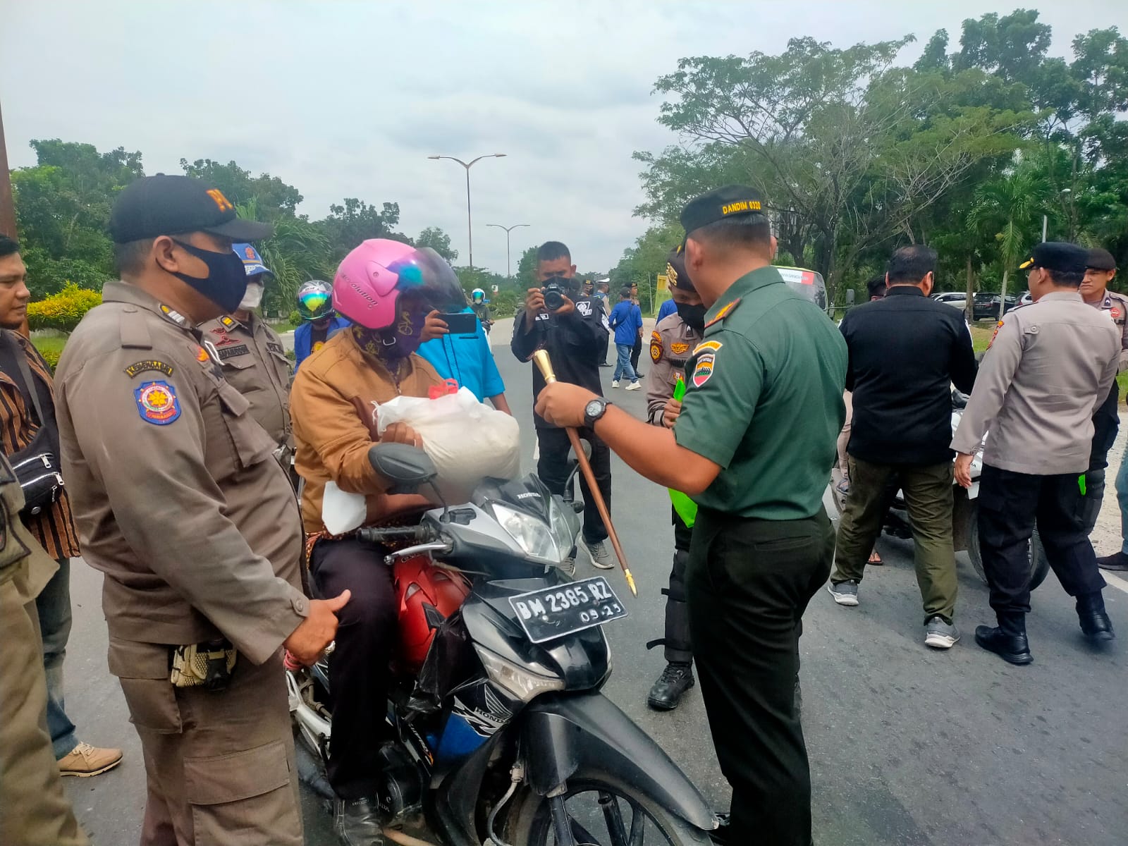 DUMAI (MR) - Letkol arh Hermansyah Tarigan selaku Dandim 0320/Dumai bersama Kepolisian Resor Dumai membagikan ratusan paket bantuan sosial (bansos) kepada masyarakat yang terdampak penyesuaian harga Bahan Bakar Minyak (BBM) bersubsidi, (8/9)
