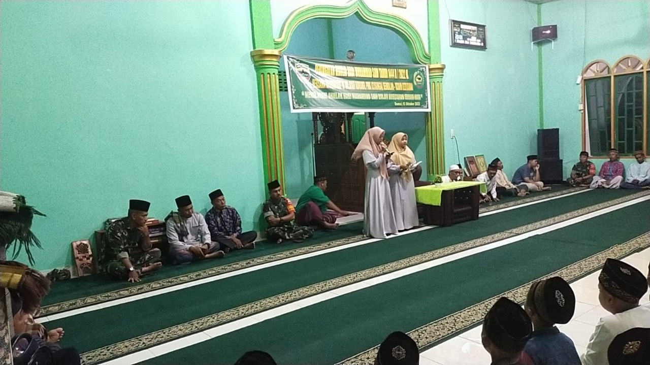 DUMAI (MR) - Koramil Pwk 03/Sungai Sembilan – Kodim 0320/Dumai menggelar kegiatan peringatan Maulid Nabi Muhammad SAW tahun 1444 H/2022 M bersama dengan Unsur TNI-Polri dan masyarakat di kecamatan sungai sembilan. Kegiatan dilaksanakan pada hari sabtu, 15 Oktober 2022 kemarin.