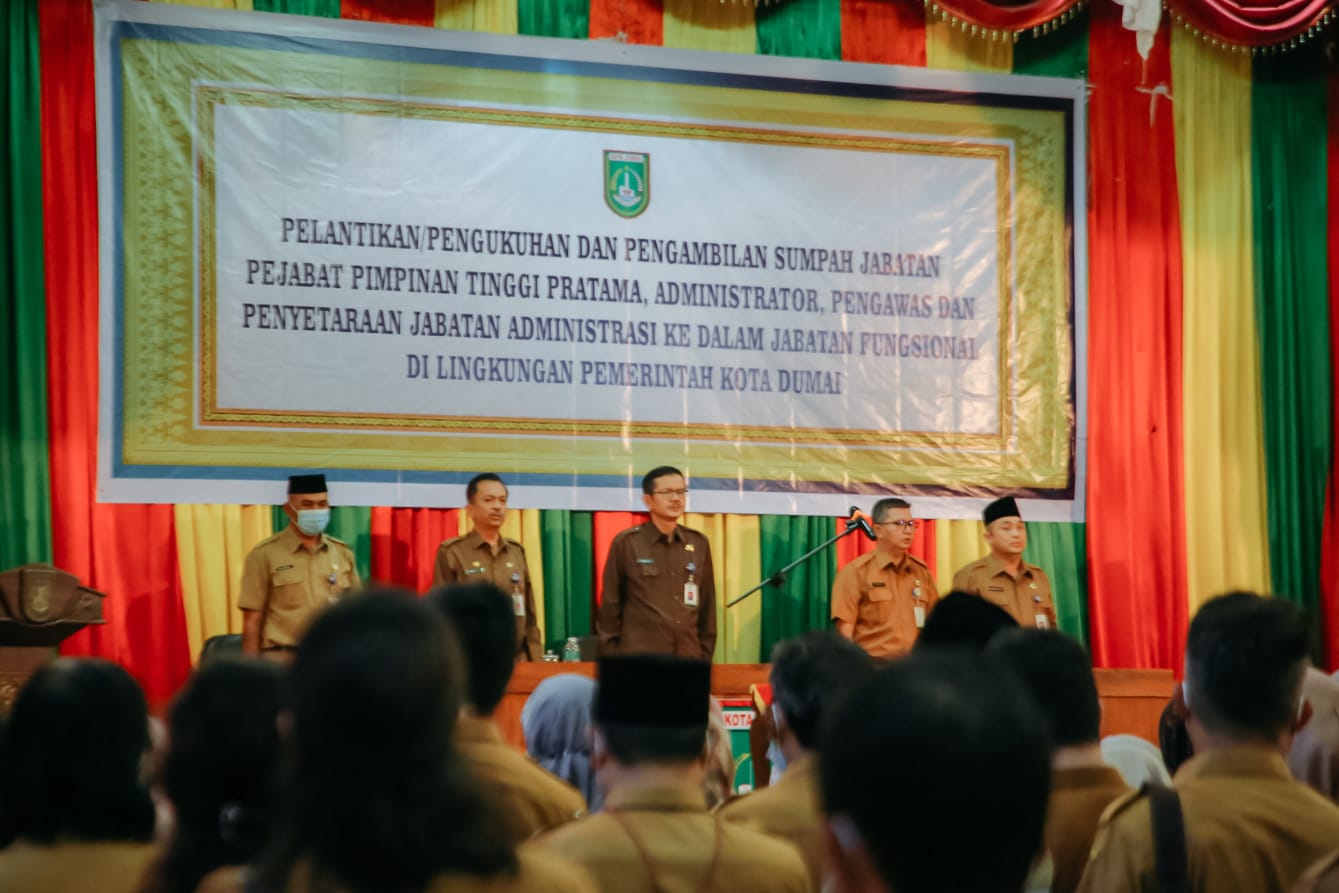 DUMAI (MR) - Sebanyak 226 orang pejabat Pimpinan Tinggi Pratama, Administrator, Pengawas dan 272 orang Jabatan Fungsional dengan total keseluruhan sebanyak 498 dilantik dan diambil sumpah, bertempat di Balai Sri Bunga Tanjung, Senin (30/5/2022) pagi.