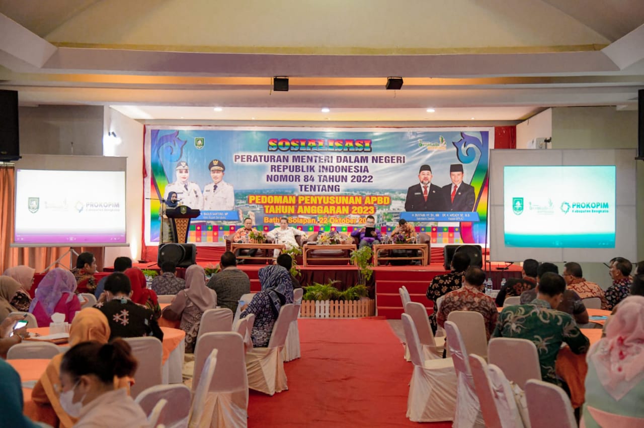 BATHINSOLAPAN (MR) – Bupati Bengkalis Kasmarni membuka sosialisasi Peraturan Menteri Dalam Negeri (Mendagri) nomor 84 tahun 2022 tentang pedoman penyusunan Anggaran Pendapatan dan Belanja Daerah tahun 2023, Sabtu, 22 Oktober 2022 di Surya Duri.