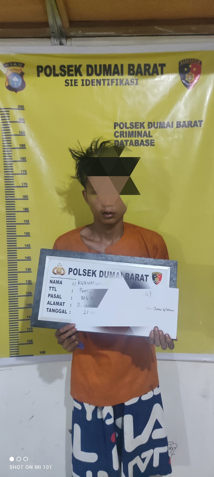 Menindaklanjuti laporan tersebut, lanjut Kapolsek Dumai Barat, Selasa (22/11/2022) dini hari Unit Reskrim Polsek Dumai Barat berhasil mengamankan KW Alias NN (20) saat sedang berada di Kelurahan Rimba Sekampung Kecamatan Dumai Kota.