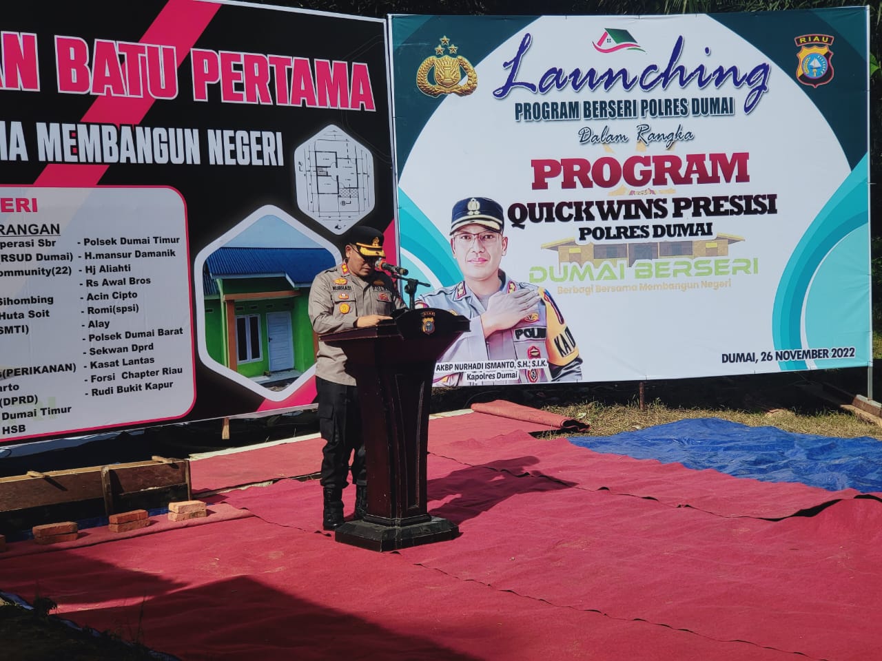 DUMAI (MR) - Kapolres Dumai Nurhadi Ismanto, S.H, S.I.K melaksanakan peletakan baru pertama Bedah Rumah dalam rangka Launching Program Quickwins Presisi Polres Dumai dengan BERSERI (Berbagi Bersama Membangun Negeri).