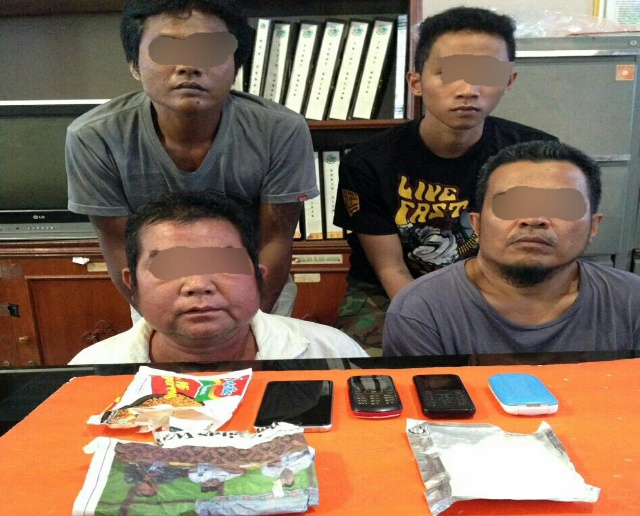 TEMBILAHAN (MR) - Sebanyak 4 pria yang tergabung dalam jaringan pengedar narkotika lintas Provinsi berhasil diamankan petugas kepolisian, Minggu (12/2/2017) kemarin.